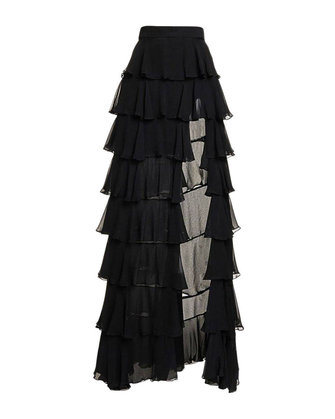 Эффектная черная юбка в пол, выполненная из легкой полупрозрачной ткани и украшенная каскадом воланов.